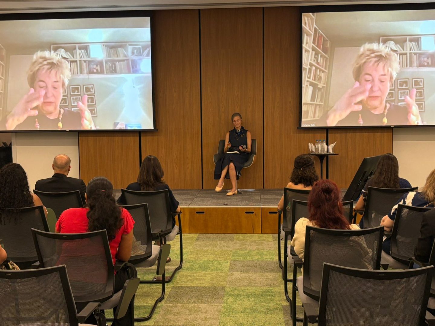 A tradutora Juliana Tonin trouxe trechos de entrevista entre Nilson Luiz May, presidente da Unimed/RS, e Catherine Dolto, reforçando o diálogo que atravessa oceanos e conecta práticas de cuidado.