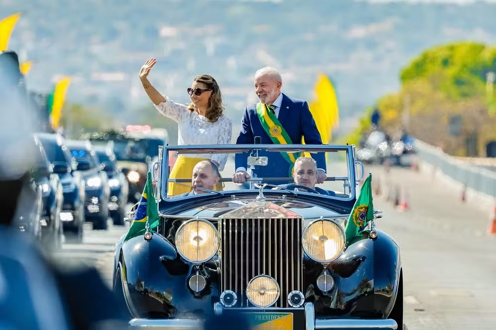 Lula chegou por volta das 9h04 ao local e desfilou em carro aberto ao lado da primeira-dama, Janja da Silva.